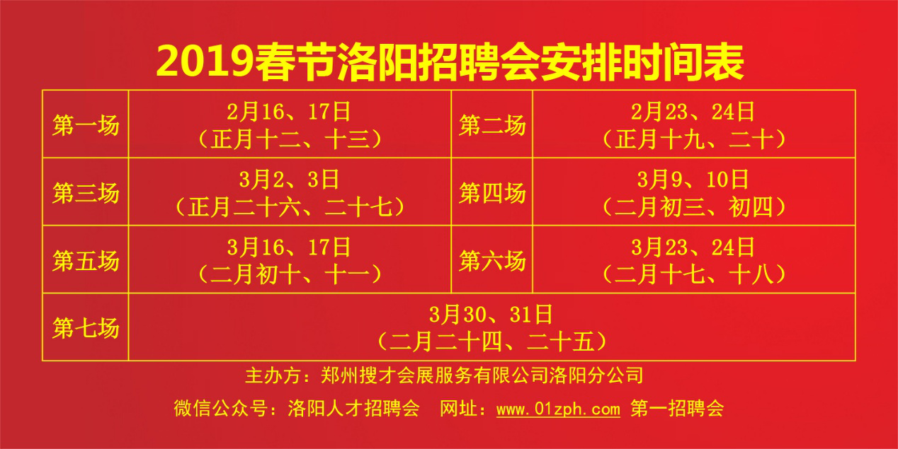 應(yīng)各大用人單位要求以及年后將達(dá)到人才流動(dòng)高峰期,2019年河南省洛陽市新春首場(chǎng)最大規(guī)模人才現(xiàn)場(chǎng)招聘會(huì)將于2019年新春223月、24號(hào)(周六周日連續(xù)兩天),隆重舉辦!本場(chǎng)招聘會(huì)是河南省洛陽市新春第二場(chǎng)特大綜合型人才現(xiàn)場(chǎng)招聘會(huì),屆時(shí)進(jìn)場(chǎng)招聘企業(yè)近百家,求職者達(dá)近萬人,既有應(yīng)往屆畢業(yè)生,也有很多有工作經(jīng)驗(yàn)的社會(huì)型人才。歡迎廣大企事業(yè)用人單位和及各高校應(yīng)往屆畢業(yè)生前來參會(huì),求職者免費(fèi)進(jìn)場(chǎng)找工作。莫失一年一度求職招聘黃金季,展位火爆預(yù)定中!