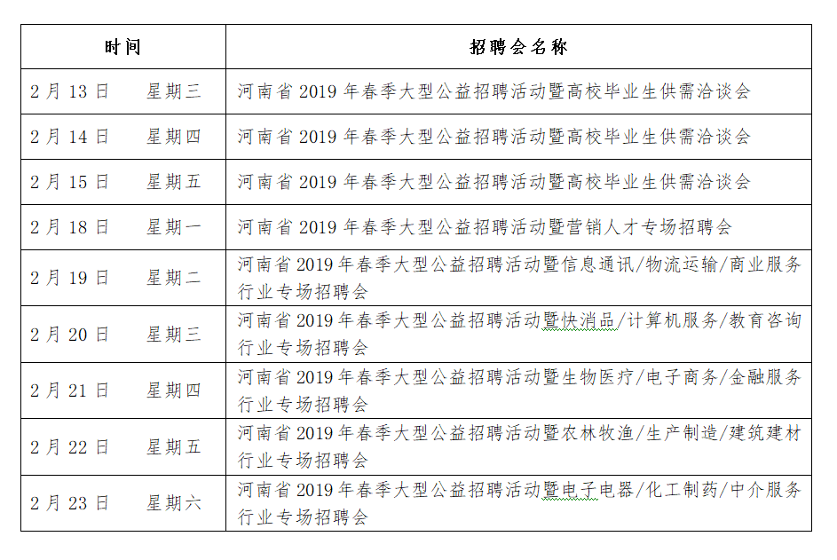 1月9日,記者從河南省人才交流中心獲悉, “河南省2019年春季大型公益招聘活動”(后附招聘時間表)將于 2月13日至2月23日在河南人才市場舉辦。