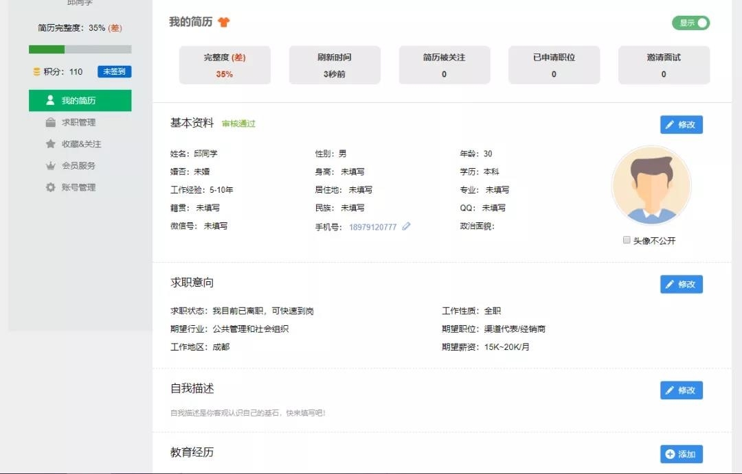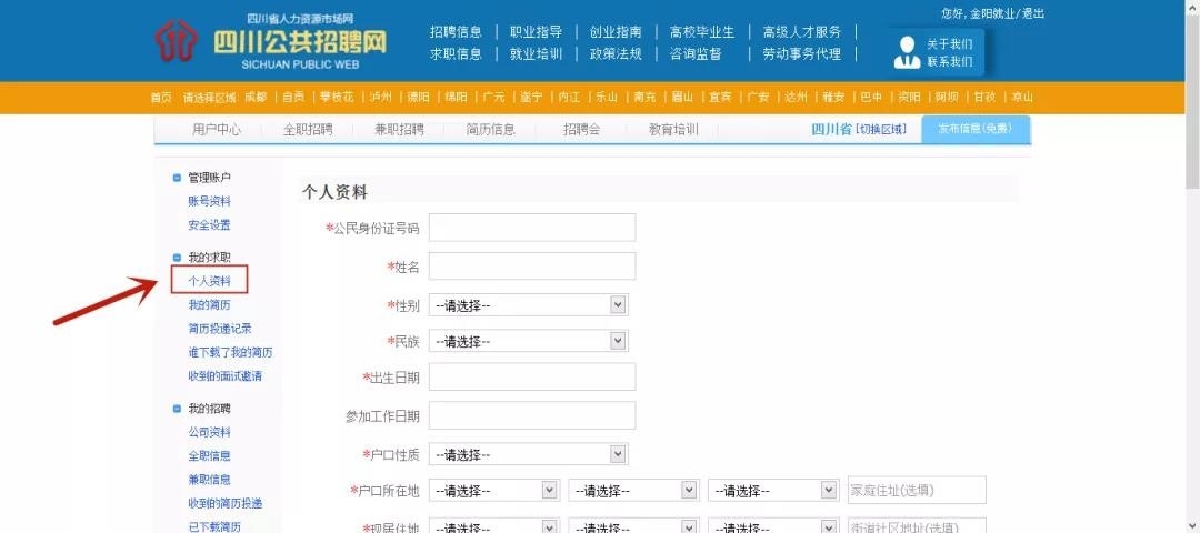 3.登錄賬號(hào),點(diǎn)擊左側(cè)菜單【我的求職】→【個(gè)人資料】,在右側(cè)的個(gè)人資料表單里面完善個(gè)人信息。