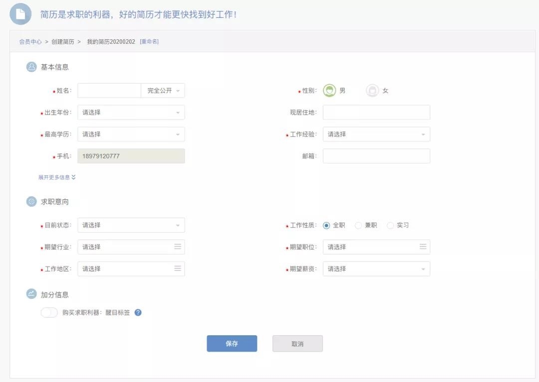 第三步,完善個(gè)人簡(jiǎn)歷:點(diǎn)擊【完善簡(jiǎn)歷】,進(jìn)入簡(jiǎn)歷編輯頁(yè)面,將簡(jiǎn)歷信息完善至90%,提供求職競(jìng)爭(zhēng)力。如下圖所示: